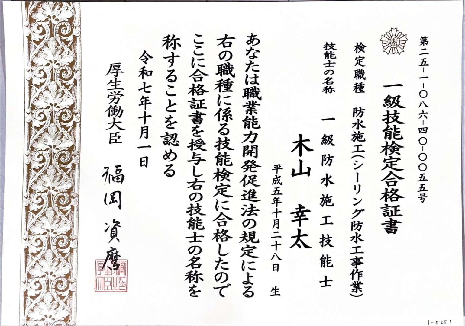 一級防水施工技能士(シーリング防水工事作業)の木山氏です。